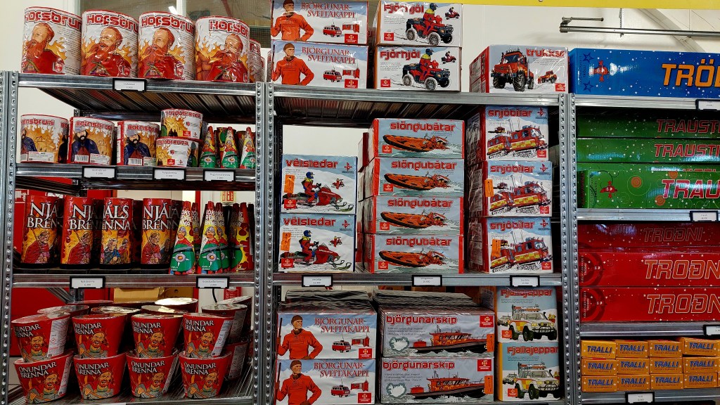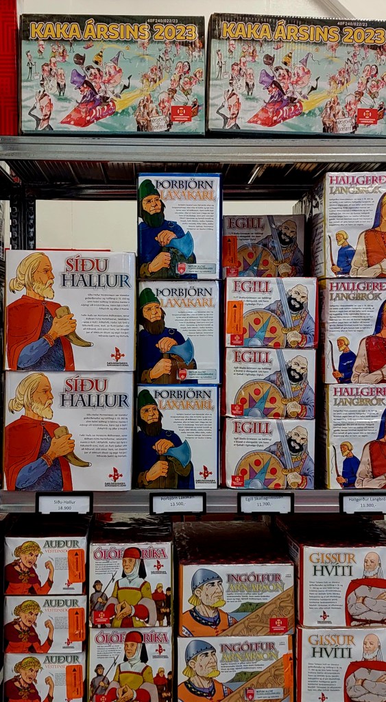Nopērkamas ir arī speciālas aizsargbrilles. Interesanti, ka pirotehnikas pakas un dažāda izmēra kastes tiek nosauktas sāgu varoņu vārdos ar islandiešu humoram piemītošu šarmu, piemēram, “Grīmura Hegsona