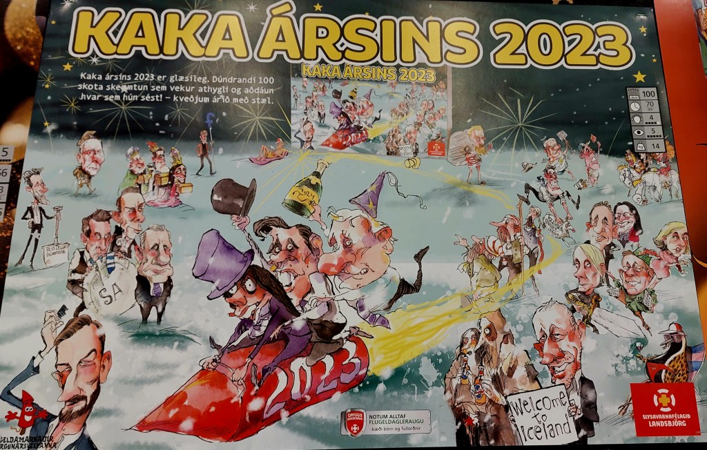 Katru gadu tiek izveidota “Kaka ársins 2023”, – gada uguņošanas kūka jeb, piedodiet, “kaka”. Islandes debesis krāsu ugunspuķes rotās līdz 6.janvārim, kad būs “Þrettándinn” svētki. Par to – citā ierakstā.