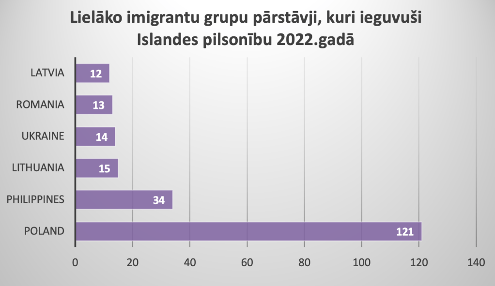 Salīdzinājumam, 2020.gada sākumā Islandē dzīvoja 55 354 imigranti, kas sastādīja 15.2 %, bet 2019. gadā imigrantu kopskaits bija 50 271 jeb 14% no populācijas.