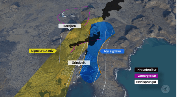 Procesiem turpinoties, 10. novembrī tektonisko plātņu kustības rezultātā tieši zem Grindavīkas izveidojās ap 15 km gara magmas daika – iežu vai magmas slānis, bieži vertikāls, kas iespiedies vecākos iežos, tos salaužot un aizpildot tajos esošās plaisas. Vulkāna izvirduma draudi bija teju pirkstiem sataustāmi, tāpēc pilsētu vēlā vakara stundā evakuēja.