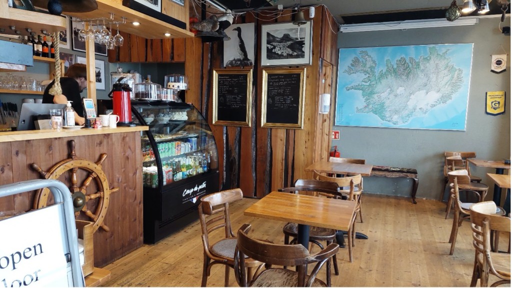 Foto: no personīgā arhīva. Kafejnīcas telpās uzņemta arī islandiešu – spāņu kopdarbā radītā filma “Lobsteru zupa” (2020.g.). Tās galvenais sižets notiek kafejnīcā, jūras rūdītiem zvejniekiem risinot pasaules problēmas un atrodot sava veida risinājumus.
