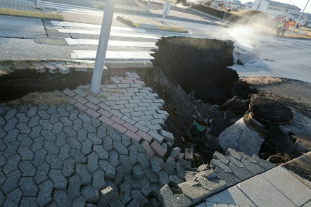 Attēlā redzama Grindavīkas ielas aina, kur radušās jaunas plaisas, tukšumi un karstā ūdens cauruļu postījumi pēc novembra vidū notikušajām zemestrīcēm. Foto avots: Eggert Jóhannesson https://icelandmonitor.mbl.is/news/news/2023/11/13/a_lot_of_damage_in_grindavik/