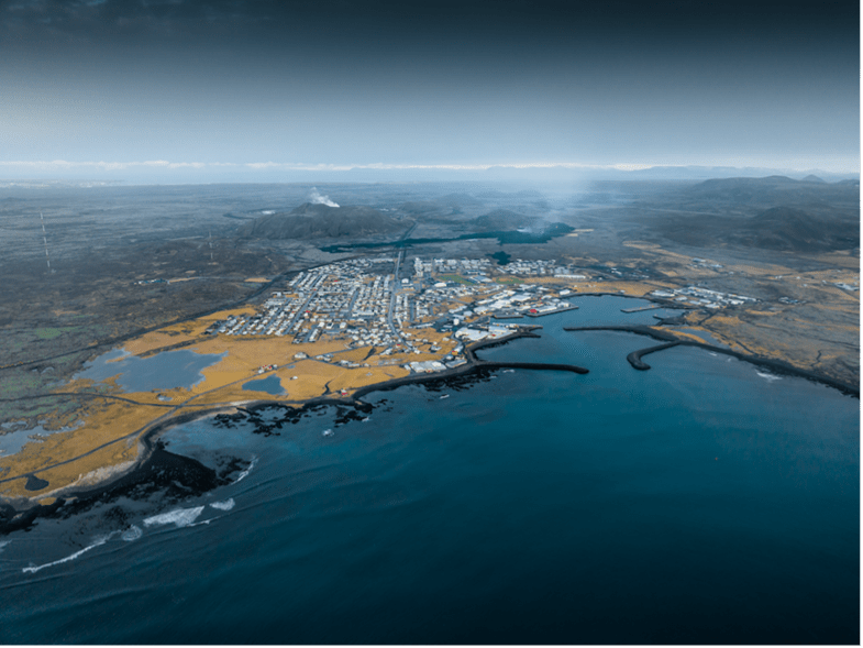 Grindavīka no putna lidojuma 2024.gadā pēc 14.janvāra vulkāna izvirduma. Foto avots: Thrainn Kolbeinsson https://www.visitreykjanes.is/en/volcano-eruption/eruption-news/eruption-by-hagafell