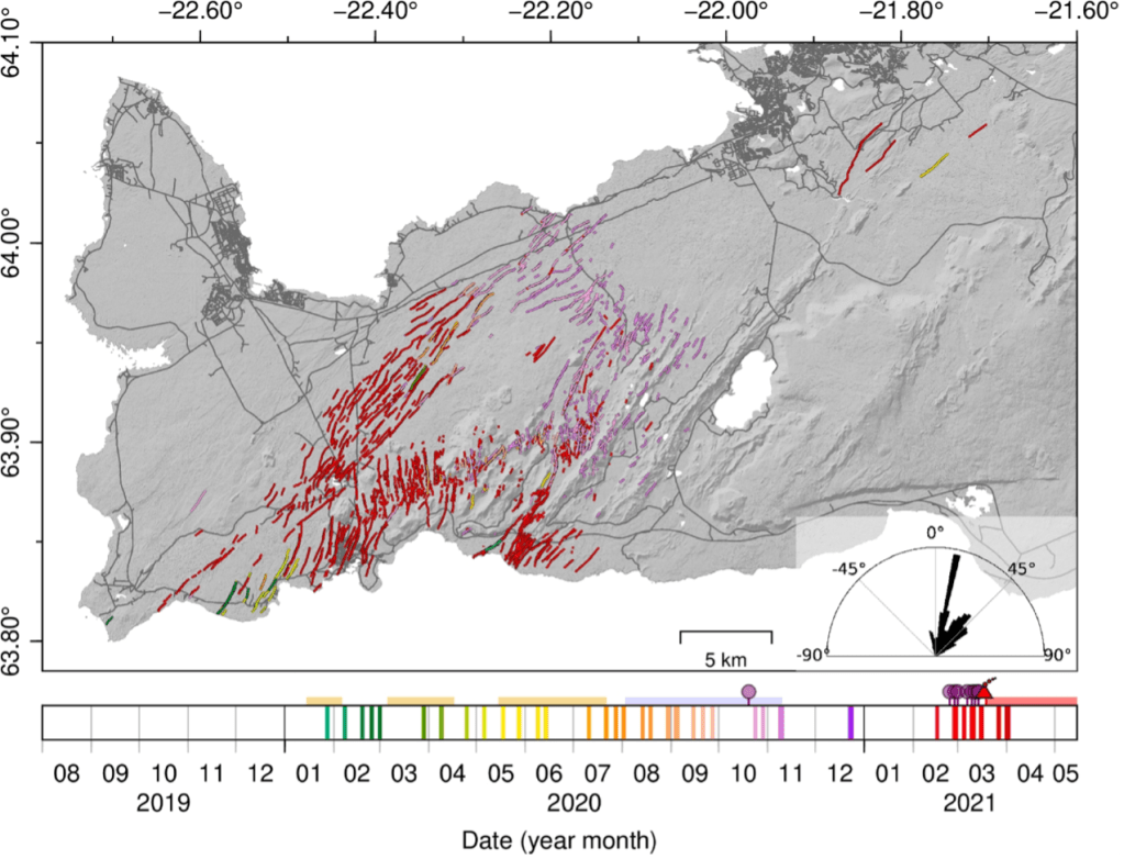 Kartē redzamās sarkanās līnijas ir uz veco plaisu sistēmām jaunizveidots plaisu tīklojums 2021.gadā, kas ir ļoti blīvs tieši Grindavīkas apkaimē. Pirms tam bija zināmas tikai divas plaisas, kas stiepās caur pilsētu, un būvējot jaundzīvojamās ēkas, cilvēki tās jau bija daļēji aizbēruši. Kartes avots: https://link.springer.com/article/10.1007/s00445-023-01699-0