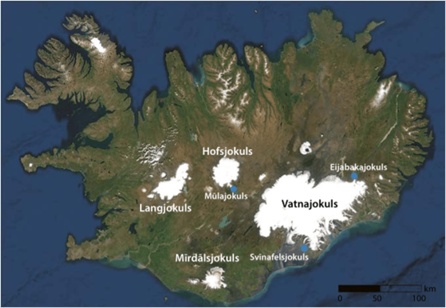 Islandes lielākie ledāju kupoli. Kartes avots: Lamsters, K. Mūsdienu ledāji. 2021. LU Akadēmiskais apgāds.