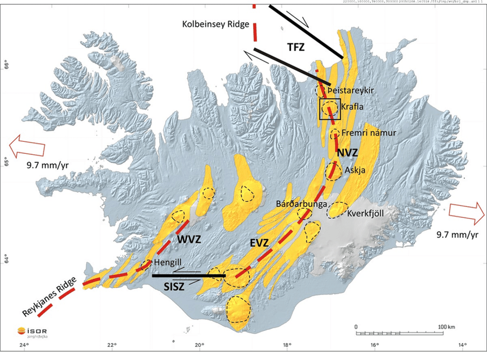 Kartē redzama tektonisko plātņu lūzuma zonas un Kraflas vulkāniskās sistēmas atrašanās vieta (melna kvadrāta laukums). Kartes avots.
