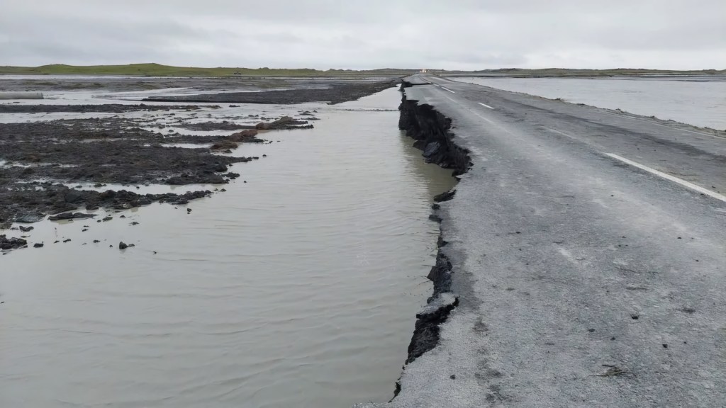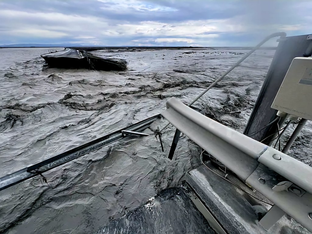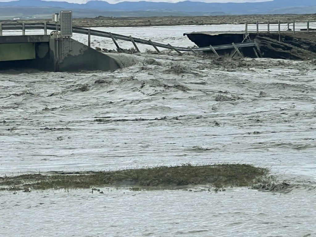 Ap 17:00 ledāja kušanas ūdeņi aizrāva prom tiltu pār Skaulmuras (Skálmur) upi, paārdīja mūsu vienīgo lielceļu Nr.1 apmēram 1 km garumā, atstājot tūristus abās tilta pusēs lielā neziņā.