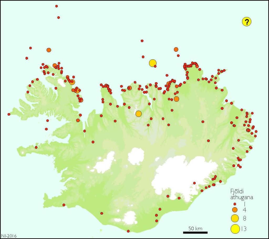 Kartē redzamas leduslāču novērojumu vietas. Punktu lielums attiecīgi apzīmē novēroto lāču skaitu. Avots: https://www.ni.is/en/fauna/mammals/hvitabjorn