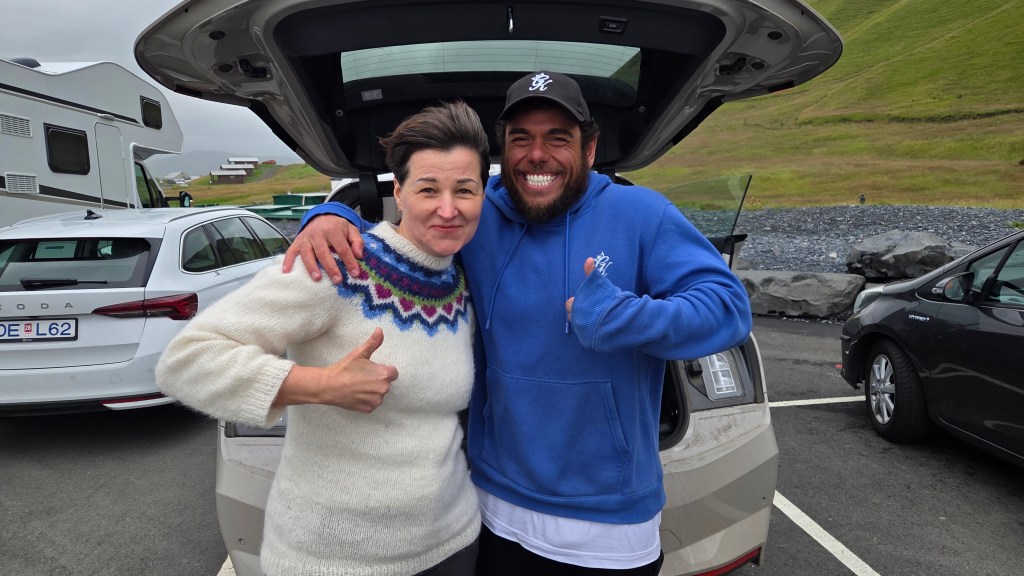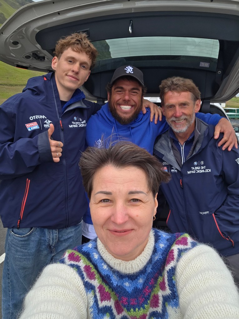 2. augustā Reinisfjaras pludmalē tā satiku britu ultra-maratonu jūras ūdeņu peldētāju, atlētu, grāmatu autoru, Ginesa rekordu sasniedzēju Rosu Edgleju (Ross Edgley), kurš pirmo reizi mūžā apņēmies sasniegt vēsturisku pasaules rekordu un nopeldēt vairāk kā 1610 km apkārt Islandei pulksteņrādītāja virzienā simts dienās. Savu peldēšanas ultra-maratonu Ross sāka jau 2025.gada 16.maijā no Reikjavīkas. Kā atzīst pats izcilais un vienmēr smaidīgais peldētājs: ”Tas būs brutāli, bet skaisti”.